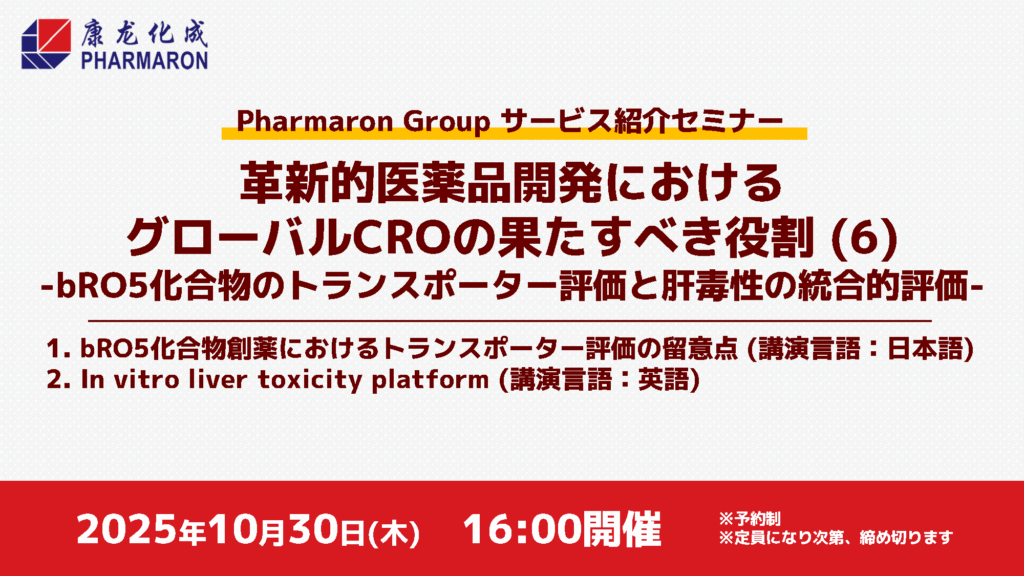 ■演 題:「革新的医薬品開発におけるグローバルCROの果たすべき役割 (6):bRO5化合物のトランスポーター評価と肝毒性の統合的評価」